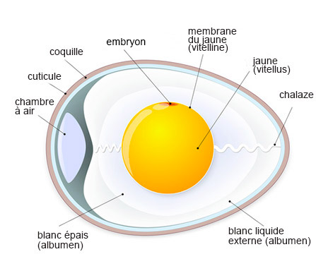 - du vitellus (jaune), soutenu par les chalazes, sur lequel repose le germe si l'oeuf a été fécondé