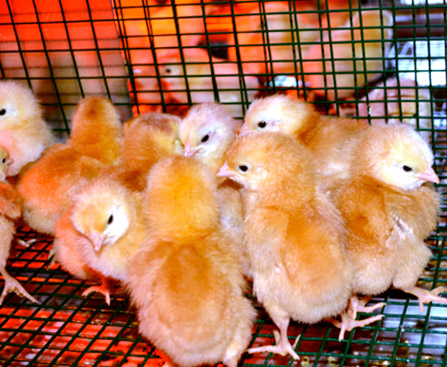 Après ces 24 heures, vous placerez les poussins dans une éleveuse, à une température de 35 °C, sur une litière de copeaux secs, ou sur grillage dans une cage éleveuse, à l'abri des courants d'air, en les nourrissant avec de l'aliment spécial poussin et de l'eau propre à volonté dans un abreuvoir spécifique.