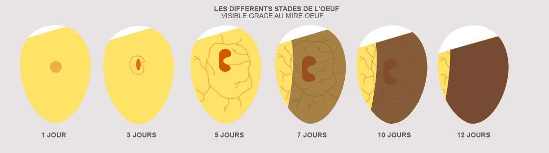 - Au 3ème jour, on peut commencer à distinguer si l'oeuf est bien fécondé. Au 7ème jour d'incubation, si l'oeuf est fécondé, le mire oeuf permettra de voir les vaisseaux sanguins, signe que l'embryon a commencé son développement (Voir ci-dessous les différents stades de l'incubation en images).