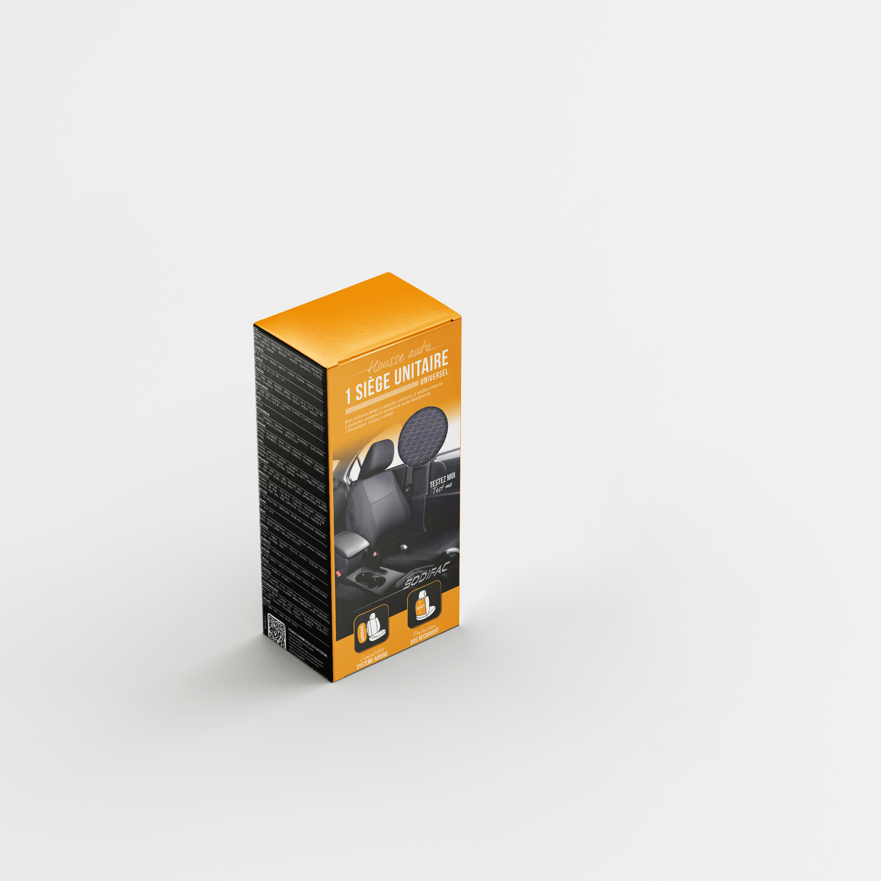 Cette housse se compose de deux éléments distincts : une protection complète pour l’assise et le dossier, ainsi qu’un appui-tête assorti. Cette conception en deux parties assure un ajustement précis, une installation simplifiée et une adaptation idéale à la majorité des modèles de véhicules.