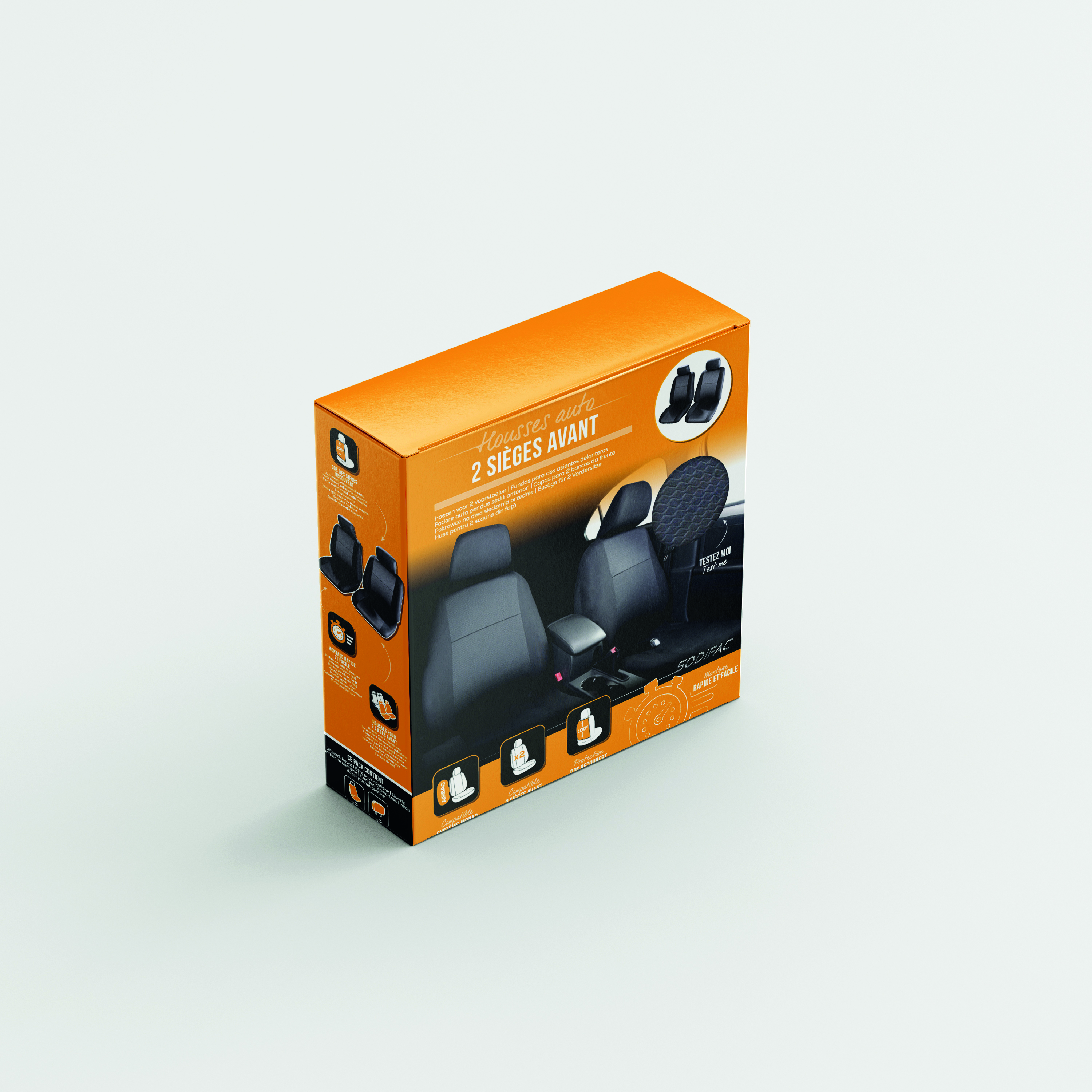 Ce kit complet comprend deux housses pour sièges avant d’une seule pièce, avec dossier entièrement recouvert, ainsi que deux housses d’appuis-tête assorties pour une protection homogène et soignée. Leur conception monobloc assure un maintien parfait, sans pli ni glissement, même lors de trajets longs ou dynamiques.